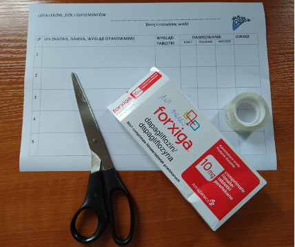 3. Przygotować flamaster (najlepiej czarny, żeby uzyskać jak najlepszy kontrast), nożyczki, taśmę klejąca, opakowania po przyjmowanych preparatach i po jednej tabletce z każdego opakowania. Warto tabletki przymocować do opakowań, żeby nie mieć wątpliwości, która pochodzi z jakiego opakowania (może się to zdarzyć mniej doświadczonym osobom).